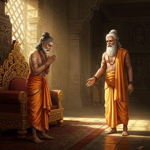 कई घंटों की घुड़सवारी के बाद, परंतक वीर नारायण एक शांत गुरुकुल में रुके, जो जंगल की हवादार मंद समीर में बसा हुआ था, जिसकी फूस की झोपड़ियाँ हरी-भरी हरियाली और प्राचीन पेड़ों से घिरी हुई थीं। जैसे ही उन्होंने अपनी प्यास बुझाने के लिए घोड़े से उतरे, घोड़े की हिनहिनाहट ने एक आचार्य का ध्यान आकर्षित किया, जो एक शिष्य के साथ अपने निवास से बाहर आए—एक पूर्व छात्र जो वर्षों बाद एक दूर के राज्य से लौटा था। आचार्य ने थके हुए राजा का अध्ययन किया, उनकी आँखें दयालु लेकिन जिज्ञासु थीं, और पूछा, “माननीय यात्री, आपको हमारे आश्रय में क्या लाया है?”